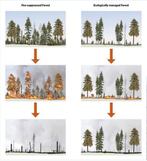 This image from The Nature Conservancy illustrates how vegetative overgrowth adds fuel for wildfires. As a result, fires become hotter and spread more widely. In contrast, the right side of the image shows an ‘ecologically managed forest.’ Here, controlled burns and proper tree spacing work together to slow the spread of fires. Ultimately, these practices help protect the forest.